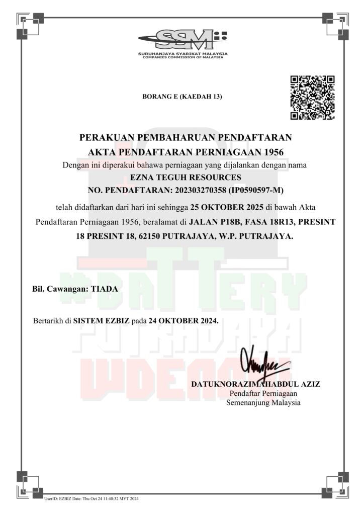 Ezna Teguh Resources (ETR Battery Solution) merupakan sebuah perniagaan yang menyediakan perkhidmatan secara langsung kepada pelanggan dalam pertukaran bateri kenderaan. Sebagai sebuah syarikat yang mempunyai pengetahuan dan pengalaman, pihak syarikat juga menyediakan khidmat nasihat serta garis panduan yang sempurna mengenai penjagaan dan tempoh penggunaan bateri yang bersesuaian mengikut keperluan pelanggan.